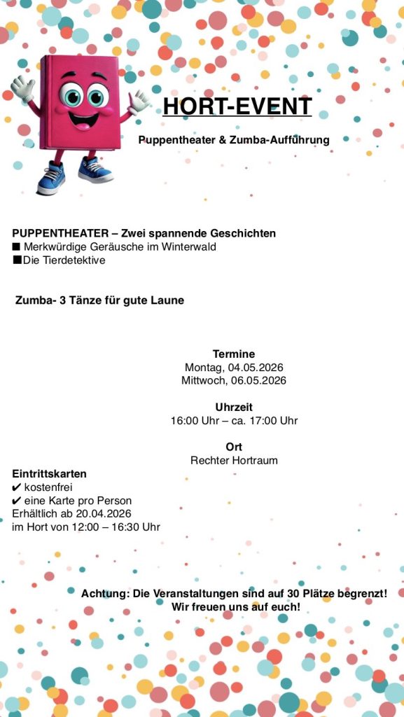 Am Freitag, den 23.06.2023 bleibt unser Hort aufgrund der Abschlussfeier des 4. Jahrgangs nur bis 16 Uhr geöffnet. Wir bitten um Beachtung!
